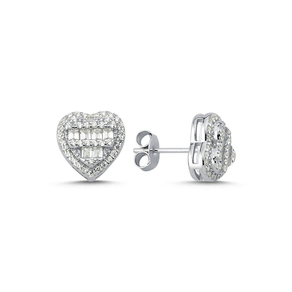 925 Silver CZ Brilliant and Baguette Cut Heart Stud Earrings