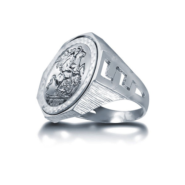solid 925 silver hand finished full Sovereign size St George coin ring with curb link design shoulders - this is Not a Sovereign coin