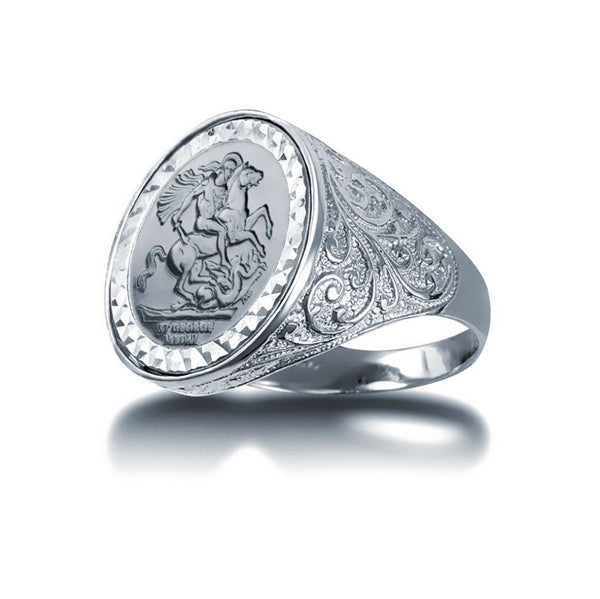 solid 925 silver hand finished full sovereign size St George coin ring with fancy carved shoulders - this is Not a Sovereign coin