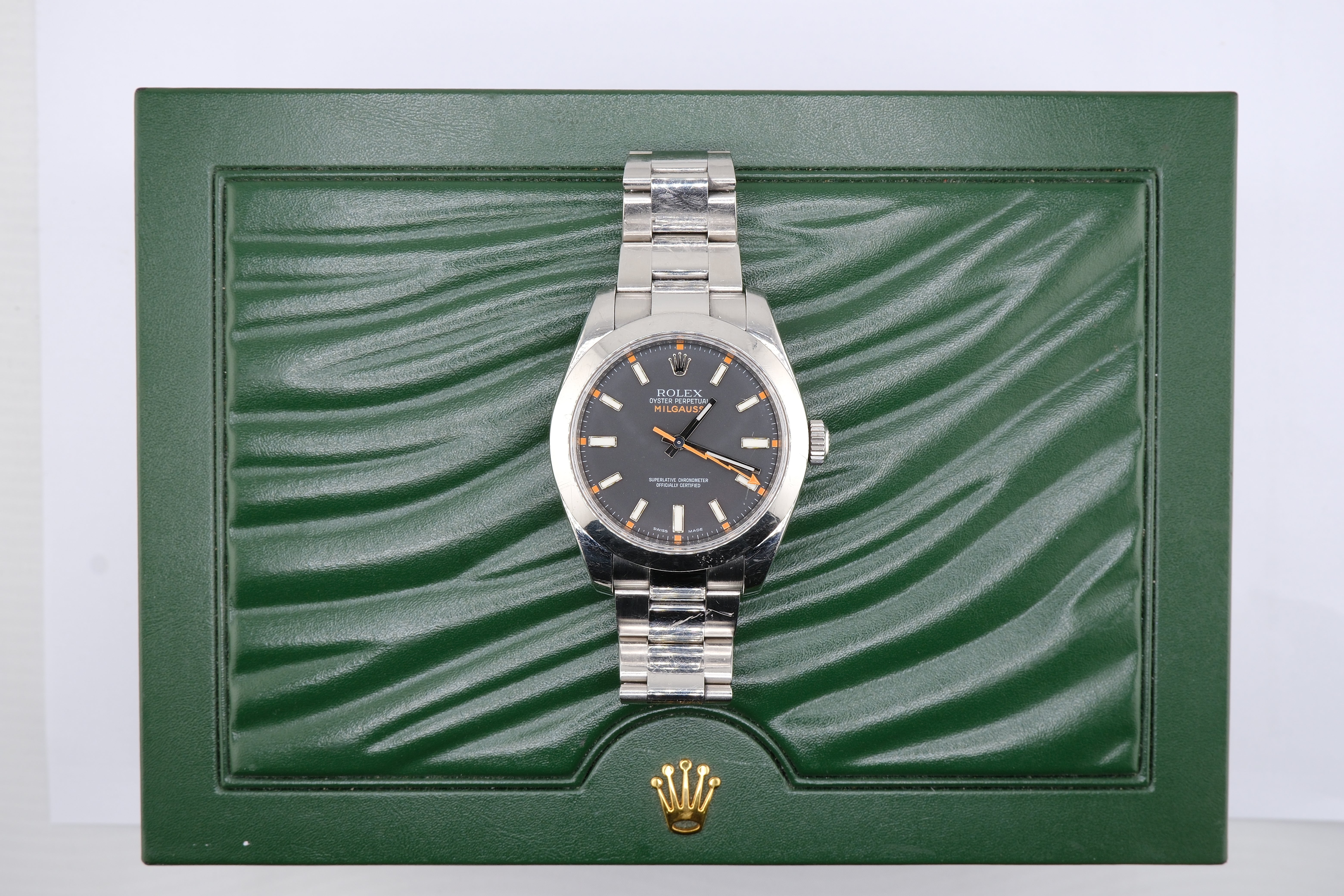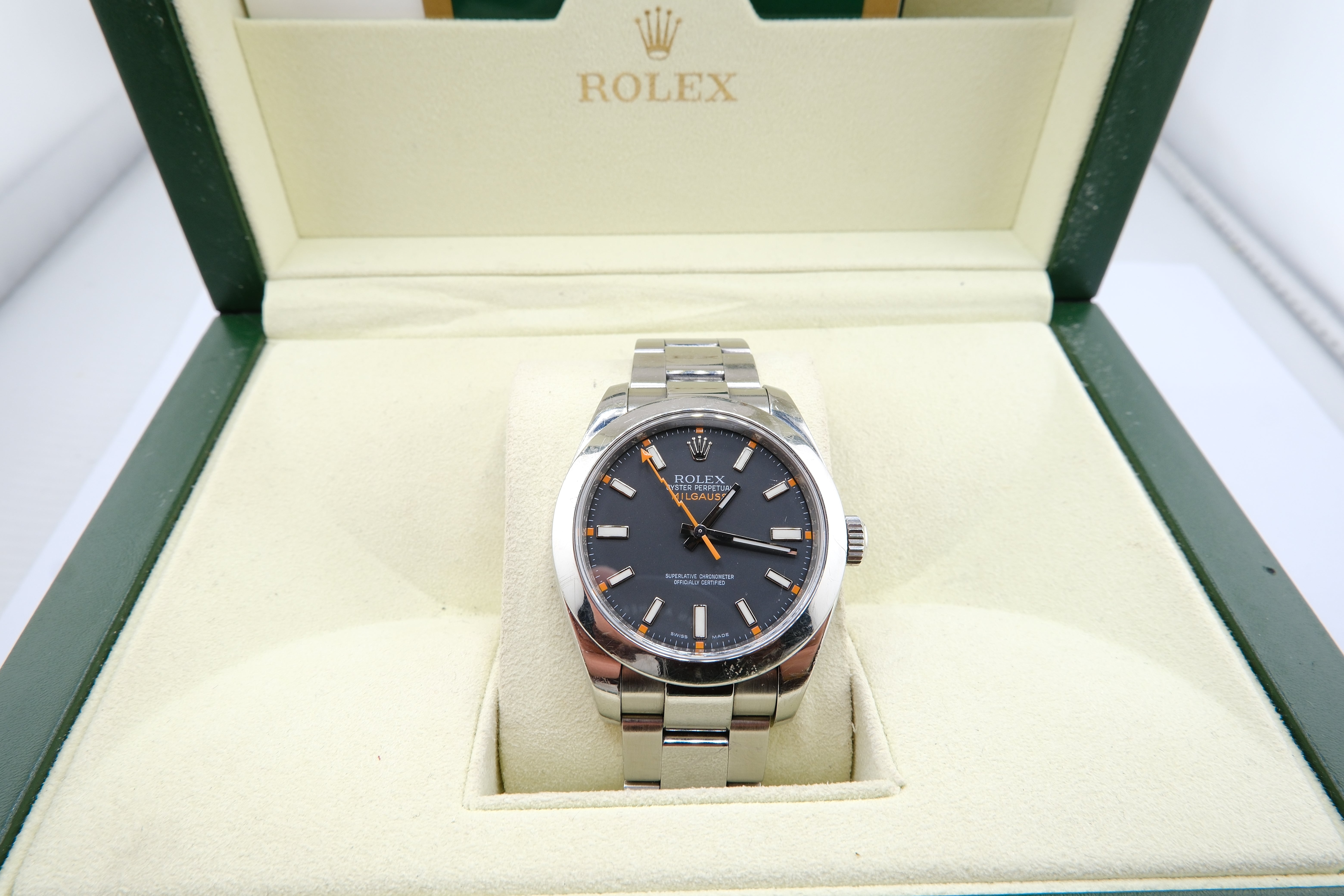 An exquisite Rolex Milgauss (116400) featuring a Black with Orange Accents dial.