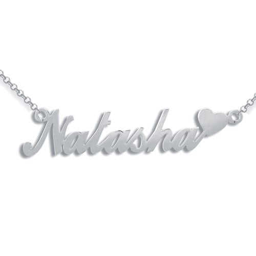 925 Sterling Silver personalised nameplate in italic style capital and lowercase letters. Price per name. The end of name is completed with a heart Please note that dimensions and weight will vary per order. Each bespoke jewellery item is unique and made to order, and therefore will be despatched within 7 - 10 days. Please note that bespoke, personalised and engraved items cannot be returned. This nameplate comes with a chain.