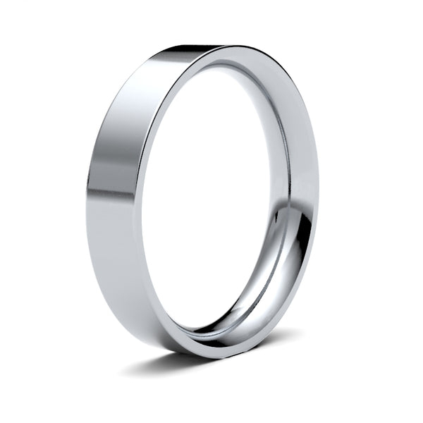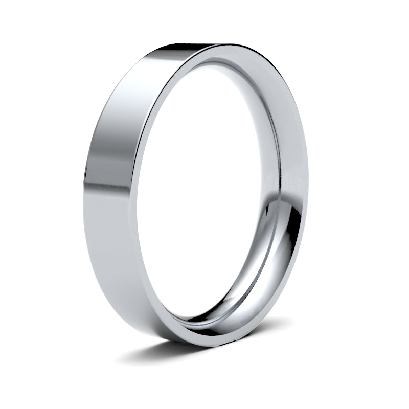 Bespoke hand-made 18ct White Gold 4mm premium weight Flat Court wedding / commitment ring. Features a brilliant hand-polished mirror-like finish. Each Bespoke jewellery item is unique and made to order, and therefore will be despatched within 2 weeks. Please note that bespoke, personalised and engraved items cannot be returned.