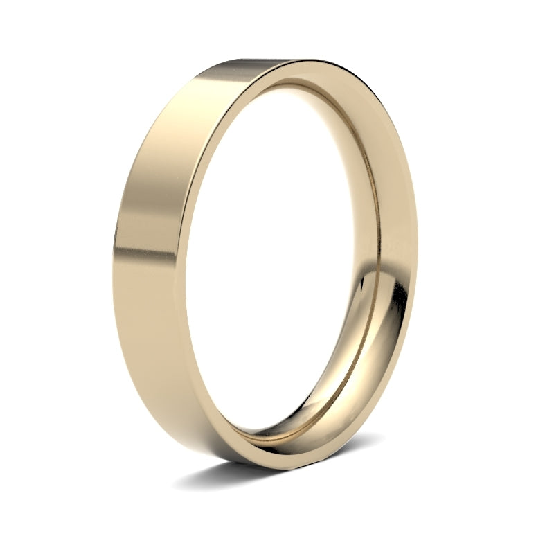 Bespoke hand-made 18ct Yellow Gold 4mm premium weight Flat Court wedding / commitment ring. Features a brilliant hand-polished mirror-like finish. Each Bespoke jewellery item is unique and made to order, and therefore will be despatched within 2 weeks. Please note that bespoke, personalised and engraved items cannot be returned.